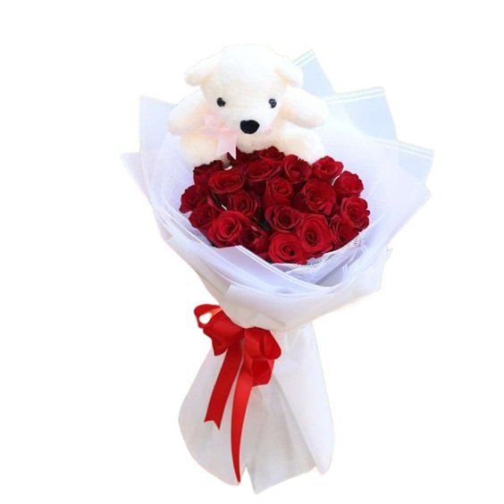 Bouuquet de 20 rosas en doble papel koreano, acompaña osito de peluche de 40 cms. El color del papel puede variar de acuerdo a disponibilidad.