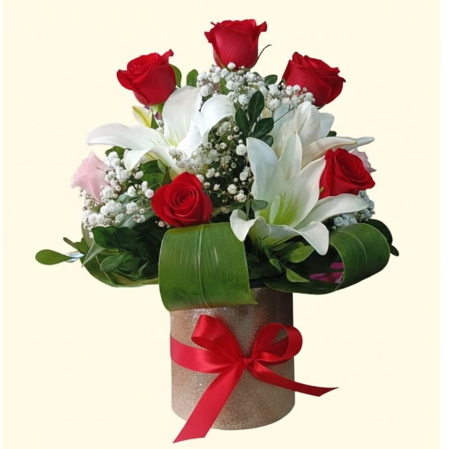 Hermoso arreglo formado por 12 rosas, liliums y florecilla ilusión.