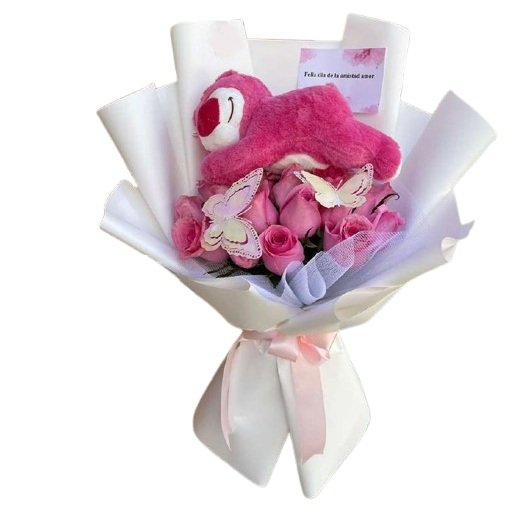 Hermoso bouquet de rosas y con mariposas junto a un bello peluche de 40 cms , el osito Lotso